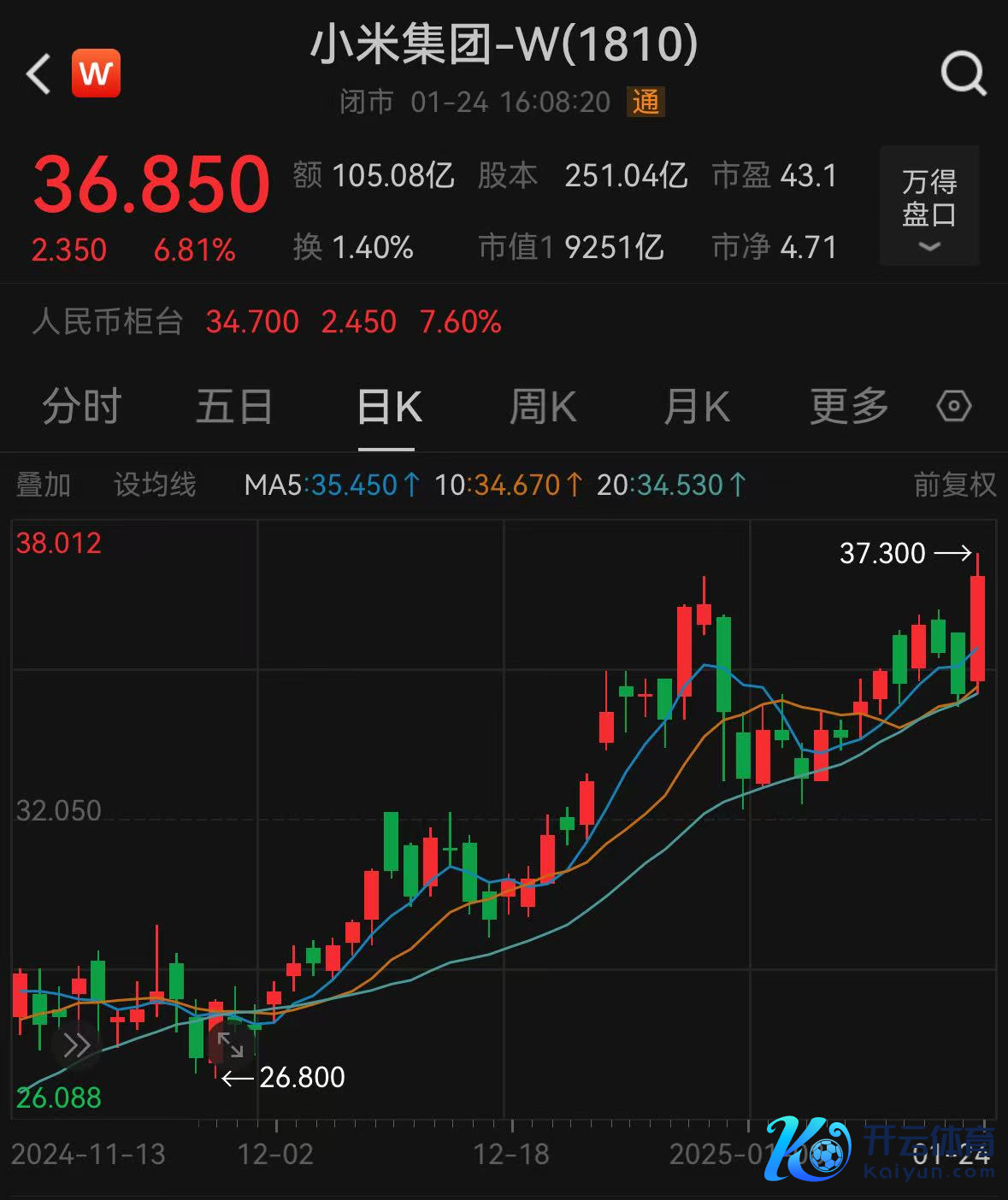 1 月 24 日,小米集团(HK1810)股价盘中一度大涨超 8%,竣事收盘,小米集团报 36.85 港元,涨幅 6.81%,收盘价为历史新高,其市值一天增多 590 亿港元。最新市值 9251 亿港元。