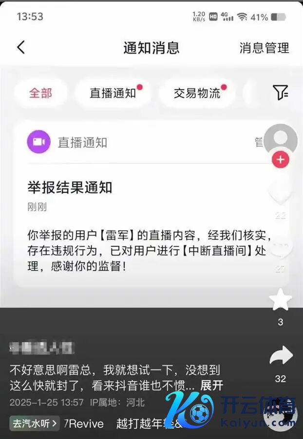 该网友还配文示意:"不好兴致啊雷总,我就念念试一下,没念念到这样快就封了,看来抖音谁也不惯着呀。"