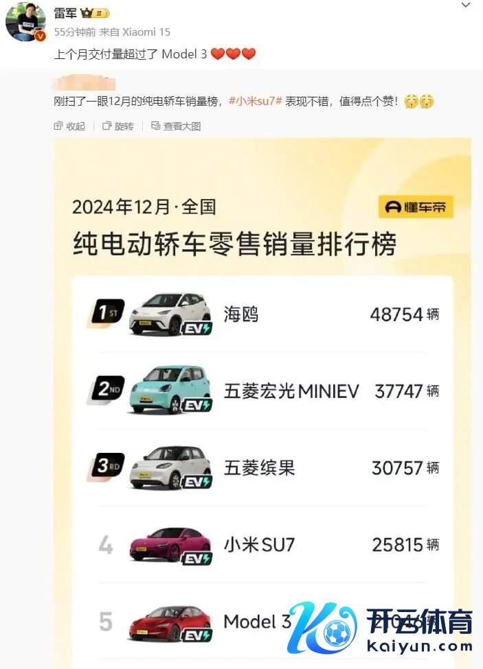 2024 年 12 月世界纯电动轿车零卖销量名次榜单走漏,小米 SU7 销量为 25815 辆,排名第四,逾越了第五名的特斯拉 Model 3(21046 辆)。