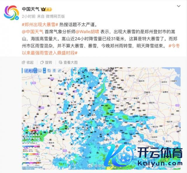 据 @中国天气,# 郑州出现大暴雪 # 热搜话题不太严谨。首席景况分析师 @Walle 胡啸示意,出现大暴雪的是郑州登封市的嵩山,海拔高雪量大。嵩山近 24 小时降雪量依然 31 毫米,这算是特大暴雪了。而郑州市区雨雪羼杂,并不算大暴雪、暴雪,今晚郑州雨转雪,未来降雪竣事。
