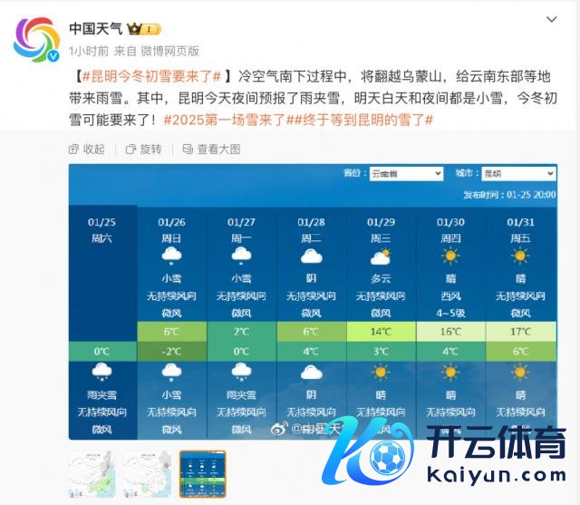 1 月 23 日,云南昆明市景况局发布"弥留景况信息论述",受强冷空气和西南气流影响,瞻望 1 月 25 昼夜间至 28 日,昆明将出现强降温寒潮雨雪天气,最高气温将下跌 14-16 ℃,局地 18-20 ℃,最低气温低于 0 ℃,并伴有小到中雪。气温最低时段为 26 日白日至 27 日。26 日,东川、寻甸、嵩明、宜良、石林禄劝阴有小到中雪,其余县(市)区雨夹雪转小雪;27 日,全市阴有小到中雪;28 日全市雨夹雪转阴;瞻望 29 日之后,冷空气裁汰,气温昭彰回升。